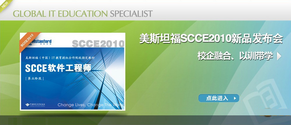 SCCE 2010是美斯坦福(中国)IT教育最新推出的高端软件工程师职业教育课程,是一款面向高等院校、促进高校专业创新、提升学生就业质量的职业教育产品。 课程采用久经实践证明、科学合理的12345体系结构:1个专业:软件开发,2年全日制在校学习时间,3个考核阶段:G1、G2、G3,4个知识模块G1、G2、G3.NET、G3JAVA,5大就 业方向:J2EE高级软件工程师、ASP.NET高级软件工程师、PHP软件工程师、数据库管理工程师、客户端页面程序员。课程体系框架合理、目标明确,内容充实、权威先进,配套 服务措施完整、过程可控,实现了真正意义上的校企融合、以训带学,能够快速帮助学员实现准职业人->职业人->成功企业人的转变和突破,获得可持续发展的信心和能力,早 日实现人生价值。